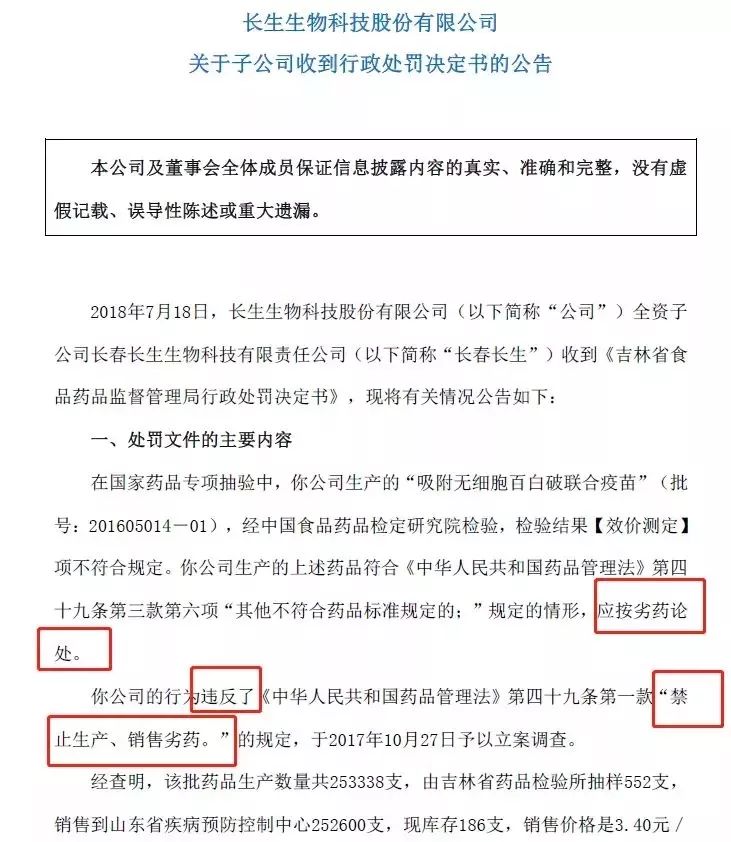 长生生物公告称,2018年7月18日,长生生物全资子公司长春长生生物科技有限责任公司(下称“长春长生”)收到《吉林省食品药品监督管理局行政处罚决定书》。